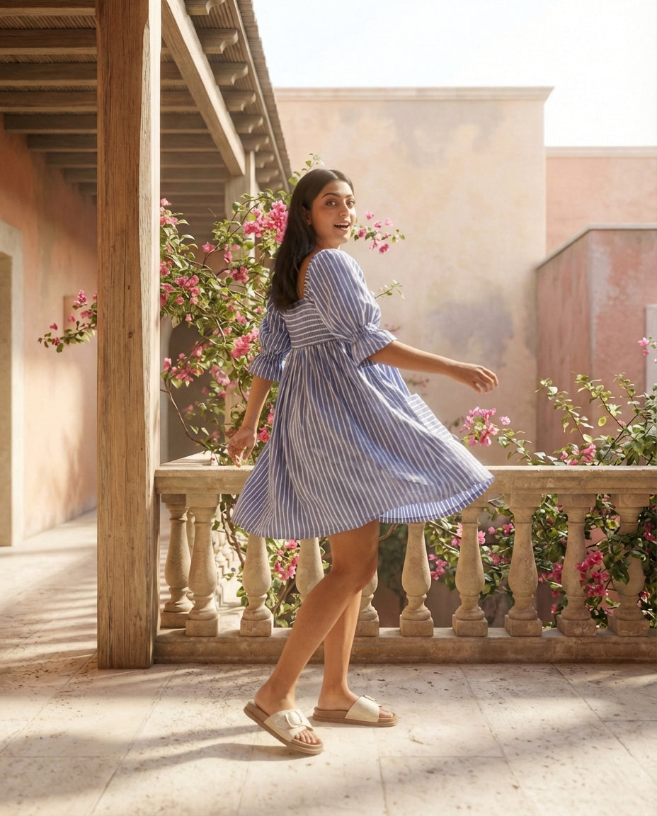 • Category: Mini Dresses • Fit: Empire Waist • Length: Mini (above the knee) • Neckline: Square Neckline (Front and Back) • Sleeve Type: Elbow-Length Puff Sleeves with Elastic Ruffle Cuff • Color: Sky Blue & White Stripe • Sizes: XS, S, M, L, XL • Occasion: Beach Day, Summer Picnic, Casual Workwear