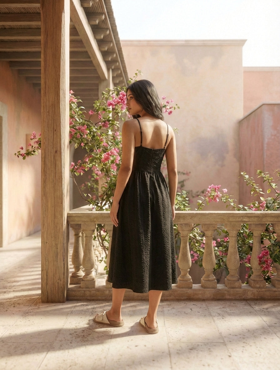 - Fit & Flare cut with flowing midi skirt